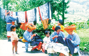 季節(jié)在閑著,整個(gè)寨子卻在忙。漢子們隨意兜幾個(gè)煨熟的紅薯,就出門挖山土、砍柴火去了。女人們則湊到一起說(shuō)著、笑著或哼著,專心做起她們心愛(ài)的挑花活計(jì)來(lái)。吊腳樓、屋檐下、火塘邊、堂屋里、巖石上、小溪旁,到處都散落著三三兩兩挑繡花裙的姑娘。提起挑花,姑娘們可就來(lái)神了,個(gè)個(gè)都有一手好絕活,誰(shuí)都可以說(shuō)出好幾個(gè)道道來(lái)。她們從六七歲時(shí)起,就要在娘手把手的嚴(yán)格規(guī)訓(xùn)下,穿針引線,學(xué)著挑花。年復(fù)一年,傾其心智,從不間斷,直到終老。
