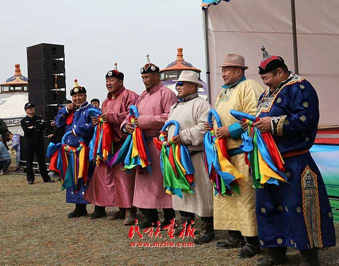 巴音昌呼格草原舉行。圖為被授予“將嘎”(彩帶)的鄂爾多斯搏克們