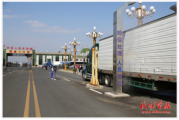 不斷有旅游大巴和貨車從琿春口岸駛過。圖為準(zhǔn)備入境中國的俄羅斯大貨車做檢疫處理