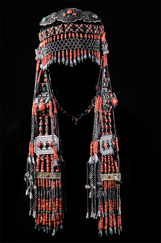 額頂飾:飾在頭箍之上, 形狀近似橢圓形,前部有四塊方形銀片,上掐絲嵌綠松石和珊瑚,其中最前部掐絲鑲紅珊瑚、綠松石拼成的蝴蝶型圖案, 銀掐絲工藝為托座。從整體來看銀絲捧紅花綠葉, 十分美麗。額頂飾兩端縫于青緞頭箍上, 居于整個(gè)頭飾的中心位置。