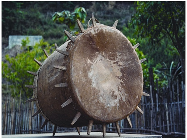 民族文化宮博物館藏基諾族木質(zhì)皮鼓,鼓面直徑55厘米,高88厘米,長(zhǎng)約130厘米,20世紀(jì)八十年代征集于云南省西雙版納州景洪縣基諾鄉(xiāng)。鼓身為木質(zhì),呈圓柱形,兩端對(duì)稱。鼓有兩面,用牛皮蒙制。兩端鼓面邊緣各環(huán)繞嵌有花紋的上方下錐形的木棍(一側(cè)17根,另一側(cè)為20根),木棍長(zhǎng)15厘米。鼓身兩側(cè)有方形孔,為鼓的音孔,上部有兩個(gè)把手,用于系繩懸掛木鼓。因鼓面兩端邊沿嵌有數(shù)十根鼓釘,形似太陽放射出的光芒,也稱為“太陽鼓”。