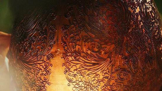 制作師傅對(duì)著一個(gè)約半米寬的“工作間”,頭頂點(diǎn)上一盞小燈,然后將待打磨的成品套在轉(zhuǎn)輪上,先用粗砂石和細(xì)砂石將釉面磨平,再用黃石、椴木細(xì)磨,直到磨出景泰藍(lán)特有的光亮。旋轉(zhuǎn)的成品和噴濺的水流構(gòu)成了一曲愉悅的勞動(dòng)者之歌,就在這樣的旋轉(zhuǎn)中,景泰藍(lán)告別黯淡,周身散發(fā)出新鮮的光彩,經(jīng)鍍金工序后更顯出華貴的藝術(shù)氣質(zhì)。