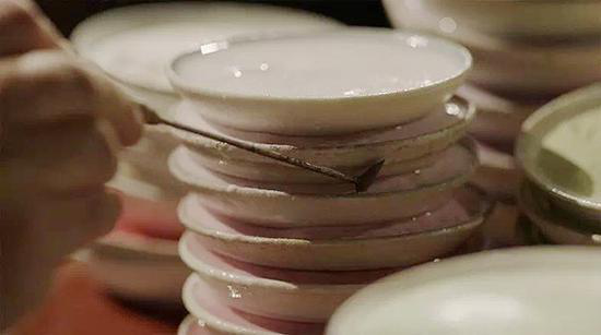 在每一個(gè)點(diǎn)藍(lán)的師傅面前,都由低到高排著一摞白色小碟,里面是摻了水的釉料。細(xì)看去,同樣是紫色,但從深紫到淺紫,竟然能分出十多種層次來(lái)。制作精良的景泰藍(lán)作品,對(duì)點(diǎn)藍(lán)要求很高。一片花瓣,要描繪顏色的漸變,就要由深入淺潤(rùn)染幾個(gè)層次,才能表現(xiàn)出花朵特有的美感——這也是景泰藍(lán)的魅力所在,如果一朵花瓣只涂一二種顏色,功夫省了,景泰藍(lán)之美也消失了。