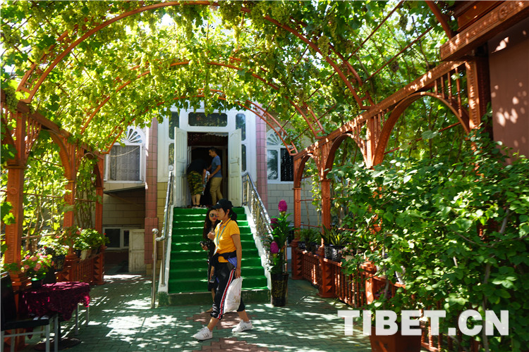 除了古老的純木質(zhì)結(jié)構(gòu)民宿,喀贊其還有各式磚石結(jié)構(gòu)的民居。院落寬敞明亮、華麗氣派,家家種植著花草、蔬菜,郁郁蔥蔥、生機(jī)盎然,葡萄廊架已成為每家的“標(biāo)配”,葡萄架下是家人休閑、朋友聚會(huì)的地方。圖為當(dāng)?shù)孛窬釉簝?nèi)。