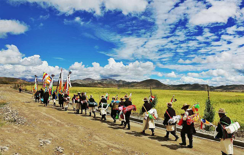 節(jié)日的第一天早晨,當陽光撒滿金黃麥田的時候,農(nóng)民們手持麥穗圍著農(nóng)田轉(zhuǎn)圈游行,最前邊是由喇嘛和老年農(nóng)民組成的儀仗隊,高舉佛像,背著經(jīng)書,吹著佛號,感謝上天給人們帶來了風調(diào)雨順的好年成。轉(zhuǎn)完麥田以后,照例要在廣場上舉行群眾性文娛體育活動,其中有藏戲、歌舞、跑馬、射箭、拔河等,十分熱鬧。這天,家家戶戶都要準備充足的酒食,穿上最漂亮的衣服,或者在廣場四周的草場上野餐,或者在村子里邀集親朋好友宴飲。青年男女則喜歡在晚上圍著篝火跳舞,對唱情歌,直到深夜。
