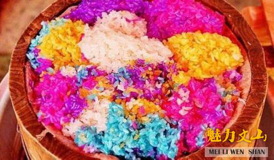 紅飯節(jié)的“紅飯”,是用一種叫紅飯葉的植物染成的。在節(jié)日的頭天,將紅飯葉洗凈放在鍋里加水煮成深紅色的汁,除去渣質(zhì),將泡好的糯米放入汁中浸泡三、四小時(shí)后控干,用甑子蒸熟即成紅飯。紅飯色澤鮮艷誘人,裝在碗里,猶如一朵初放的紅玫瑰,馨香四溢,沁人心脾,吃時(shí)沾上白糖或紅糖,味美可口。后來,紅飯逐漸變成了紅、黃、紫、黑、白等“彩色飯”。這些彩色食品,均是用紅飯葉、楊咪咪花、紫香藤、稻稈等植物的漿汁浸染而成,對(duì)人體無任何副作用。