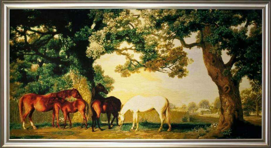 一般畫面較大,多數(shù)復(fù)制名畫、人物和風(fēng)景照片。用線顏色往往達數(shù)百種,特別強調(diào)色階、色相的過渡,并注重人物神態(tài)的刻畫。作品常作為大型建筑的室內(nèi)裝飾。