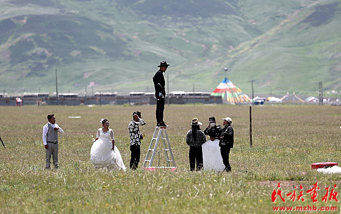 巴塘草原上,藏族情侶正在拍攝婚紗照