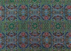 "凡錦樣必有寓意"是蜀錦的藝術特點,往往代表著對生活的愿景和祝福。織造工藝細膩嚴謹,配色典雅富麗,大多以經(jīng)線彩色起彩,彩條添花,經(jīng)緯起花,先彩條后錦群,方形、條形、幾何骨架添花,對稱紋樣、四方連續(xù),色調(diào)鮮艷,對比強烈,別具一格。