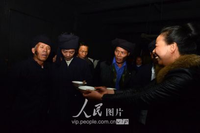 11月17日凌晨,新娘家的親戚在“發(fā)親”前與新郎家派來(lái)的“關(guān)親客”對(duì)歌敬酒。