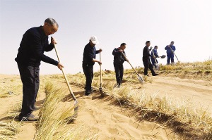 在甘肅省古浪縣境內(nèi)的黑崗沙風(fēng)沙口,八步沙治沙人用稻草壓沙。范培珅攝