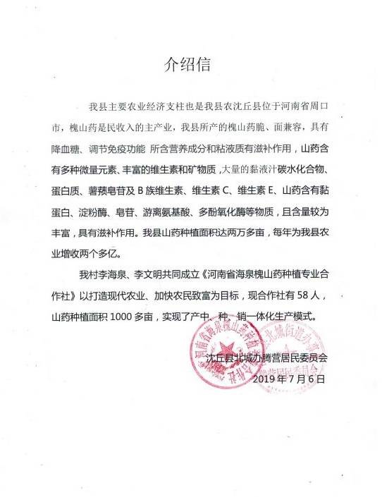 因?yàn)椤盎比龑殹钡男б婷黠@,合作社于2013年成立之初吸納社員102戶,種植面積達(dá)1000多畝。2014年5月,“槐三寶”商標(biāo)順利通過(guò)國(guó)家農(nóng)業(yè)部無(wú)公害農(nóng)產(chǎn)品認(rèn)證和無(wú)公害農(nóng)產(chǎn)品標(biāo)識(shí)使用權(quán),基地獲河南省農(nóng)業(yè)廳無(wú)公害農(nóng)產(chǎn)品產(chǎn)地認(rèn)定。發(fā)展到現(xiàn)目前,2019年,其種植面積已經(jīng)超過(guò)4000畝,產(chǎn)量在5500噸以上。據(jù)合作社監(jiān)事李文明講:“今年沒(méi)澇,現(xiàn)在七月,山藥快成熟了,可以預(yù)見(jiàn),是個(gè)豐收年。”