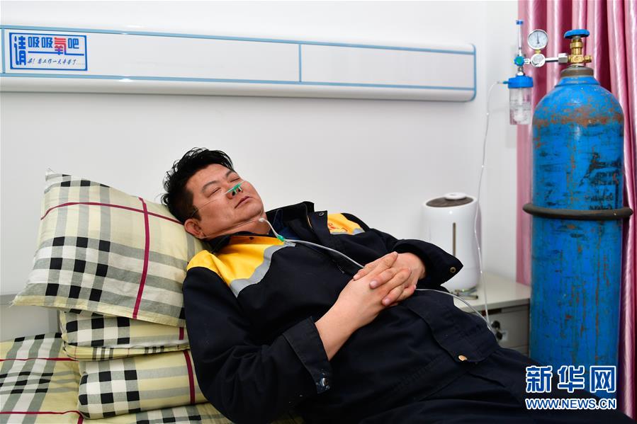 1月11日,在青藏鐵路望昆站,于本蕃在宿舍里吸氧休息。(新華社記者張龍 攝影)