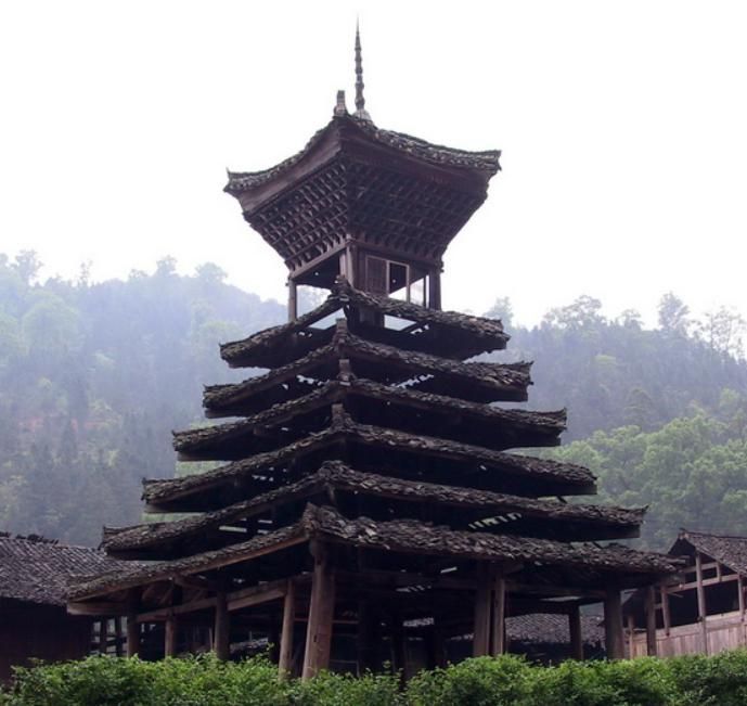 看這一座座高聳入云的鼓樓,氣勢(shì)十足,這是侗寨的標(biāo)志性建筑,爬上鼓樓最頂端,便可在侗寨中“一覽眾山小”。鼓樓的造型為杉樹,最初為“遮陰樹”。古時(shí)在樹蔭下聚會(huì)議事歌舞娛樂(lè),但樹蔭不避風(fēng)寒。勤勞智慧的古人便仿杉樹形狀在寨中建起“堂瓦”,雨能避濕,冷能避寒。
