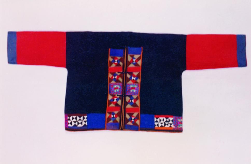 剪花衣又為“縑花衣”,是清末明初阿昌族已婚婦女的一種上衣,主要流行于云南省德宏傣族景頗族自治州梁河縣阿昌族地區(qū)。這種衣服的特點是:毛質地,多為深色,長袖圓領對襟,釘圓銅扣,前襟和衣服四周均用各種顏色的方形或三角形布片鑲縫成幾何形圖案。中間還夾雜著刺繡花紋圖案。過去,姑娘出嫁與新郎拜堂和年老去世時都要穿著剪花衣服。前者表示夫妻白頭偕老,生死不離;后者被認為到陰間可以和親人相會團聚。久而久之,穿剪花衣成為阿昌族的特定風俗。