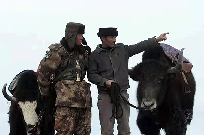 拉齊尼·巴依卡與紅其拉甫巡邏官兵騎著牦牛巡邏。(新華社記者 李翔 攝影)