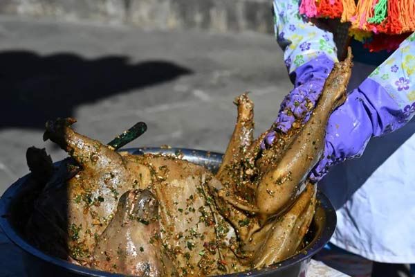 用桂皮、草果、山胡椒等十幾味調(diào)料做成料包,和竹葉一起熬煮,用煮過(guò)的水在羊的身上里外揉搓,給羊肉去膻保鮮,鎖住原味。揉完料水,還要換特制的鹵汁繼續(xù)揉搓,鹵汁里融合了苞谷酒、香辣子、六月椒、山薄荷、土香葉等十幾味香料,給羊肉提鮮增香。