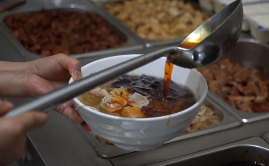 面條,是特制的人工搟制雞蛋面,與廣東云吞面相似,盤(pán)成一個(gè)個(gè)面團(tuán),下一碗,丟一個(gè)面團(tuán),方便、準(zhǔn)確又節(jié)省時(shí)間;