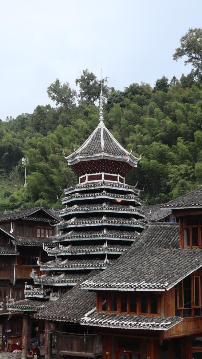 侗族鼓樓是侗族特有的木塔型重檐建筑,是侗寨的標志。樓的頂層或一樓火塘邊置有一面用于傳遞信號的牛皮大鼓,因此得名鼓樓。