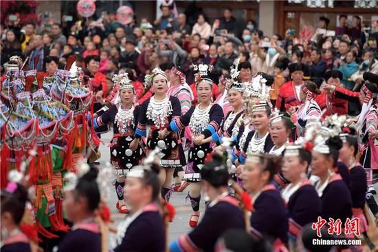 2021年11月19日,廣西龍勝各族自治縣各族民眾身著節(jié)日盛裝共跳團結舞慶祝自治縣成立70周年。中新社記者 俞靖 攝