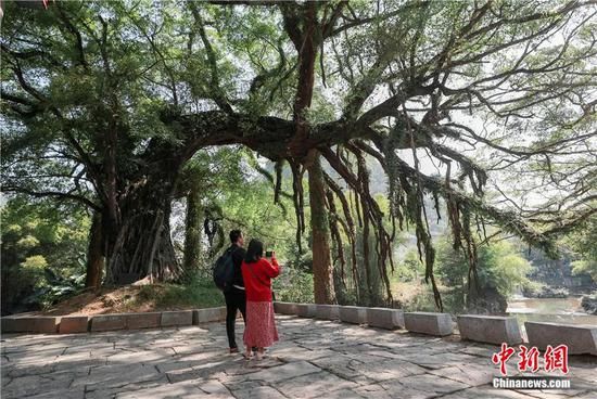 2020年10月,游客在廣西昭平縣的黃姚古鎮(zhèn)內參觀古榕樹。中新社記者 賈天勇 攝