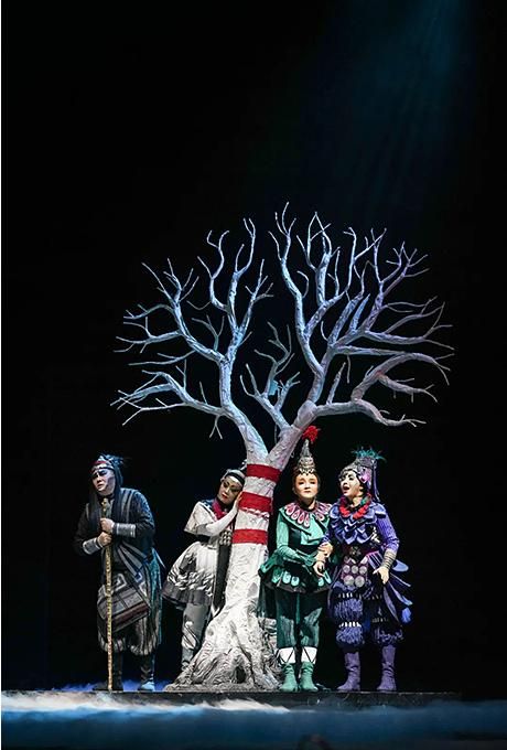 歌劇《小河淌水》在舞美、服裝、燈光,特別是音響方面都有其特色與成功之處。劇中并沒有追求奢華的舞美,而是以簡潔與流暢的方式彰顯了民族特色,取得了較好的藝術(shù)效果。
