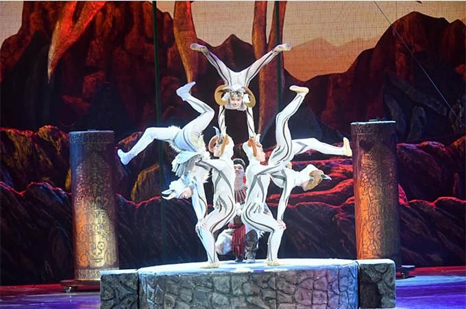 與以往傳統(tǒng)的雜技表演不同,雜技劇《巖石上的太陽(yáng)》要求演員既要完成高難度技術(shù)動(dòng)作,還要完成劇中人物角色的戲劇表演。劇目中利用多種藝術(shù)手段加之高、難、險(xiǎn)、驚的雜技節(jié)目,讓觀眾在欣賞劇目的同時(shí),能感受到一種強(qiáng)烈的文化氛圍以及巖畫(huà)帶給人們不朽的記憶。