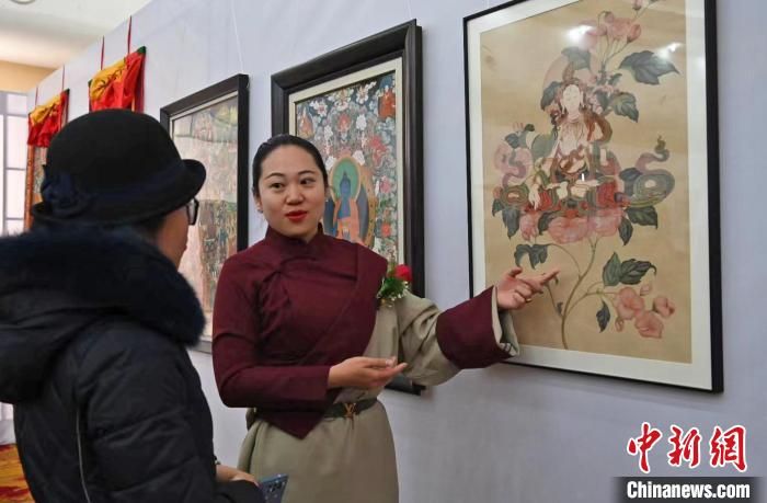 王天文是該協(xié)會為數(shù)不多的女性,自幼學(xué)習(xí)國畫。此次她的展出作品《花與佛》進行了唐卡創(chuàng)新,將漢地工筆繪法的花卉與唐卡白度母形象融合。因為熱愛藏文化,2011年她從家鄉(xiāng)河北到西藏學(xué)習(xí)唐卡,希望能探索唐卡與不同繪畫種類方式的結(jié)合。