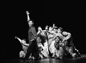 引子部分,板兒聲響,一個(gè)調(diào)皮的男孩偷跑出來(lái)聽(tīng)書,他穿越人墻等待好戲開(kāi)場(chǎng)。此時(shí),說(shuō)書人突然開(kāi)講,吸引越來(lái)越多的“觀眾”(舞者)紛紛上前,仔細(xì)聆聽(tīng)接下來(lái)發(fā)生的離奇故事。第一段舞蹈以群舞的形式表現(xiàn)人潮逐漸聚集的場(chǎng)景,通過(guò)“側(cè)耳聽(tīng)”和“左右看”這兩個(gè)動(dòng)作,反映出“觀眾”對(duì)于山東快書的好奇之心。