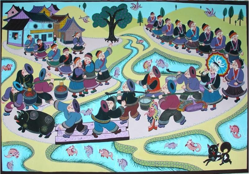 劍河現(xiàn)代民間繪畫(huà)源于傳統(tǒng)的苗族刺繡文化,是苗族刺繡文化的另一種表現(xiàn)形式和藝術(shù)升華。傳統(tǒng)的苗族文化多以服飾、歌舞為載體,并以刺繡及演唱等形式進(jìn)行表現(xiàn)和傳承。早期劍河現(xiàn)代民間畫(huà)即脫胎于具有適用性的苗族刺繡樣稿——剪紙和手繪刺繡粉本,換言之,手繪的苗族刺繡粉本便是劍河現(xiàn)代民間繪畫(huà)的雛形,劍河第一批優(yōu)秀的現(xiàn)代民間畫(huà)作者,即是原當(dāng)?shù)厥掷L粉本的能工巧匠。劍河現(xiàn)代民間繪畫(huà)多以苗族神話傳說(shuō)中的故事情節(jié)和民俗節(jié)日、生產(chǎn)活動(dòng)等內(nèi)容為題材入畫(huà),素材涵蓋自然界花鳥(niǎo)蟲(chóng)魚(yú)及人物、家畜等具體形象,造型稚拙天真,設(shè)色濃艷,對(duì)比強(qiáng)烈。作品傳達(dá)出典型的地域民俗氣息及濃厚的鄉(xiāng)土味,便是其標(biāo)志性特征。