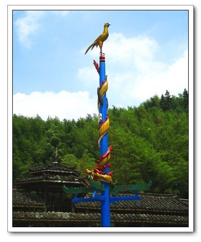 龍模型。纏著柱子尾朝上頭朝下的龍,那是出于苗族龍圖騰。意思是地上的龍,水里的龍,都朝著我們寨子來(lái),我們寨吉祥大利,人畜興旺,五谷豐登。