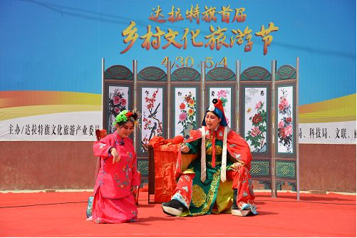 達(dá)拉特道情富有濃郁的地方色彩,生、旦、丑等行當(dāng)齊全,包括“唱、念、做、打”四功,不過由于它演唱內(nèi)容的關(guān)系,以“唱、念、做”三功為主。音樂體制主要為曲牌連綴體,同時(shí)吸收了地方小戲與北路梆子的音樂元素,又兼有地方大戲的部分唱腔曲調(diào),演唱方式以坐唱為主,樂器伴奏分為文場和武場,音樂婉轉(zhuǎn)纏綿、節(jié)奏明快,曲調(diào)開朗而流暢,唱白多運(yùn)用地方方言,藝術(shù)風(fēng)格柔美而抒情,充盈了濃郁的鄉(xiāng)土生活氣息。