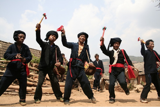 蜂桶鼓舞是布朗族的群眾性舞蹈,分為三步和五步兩種。演出時(shí),由兩名年輕男女雙手各持一條“帕節(jié)”(即毛巾)在前面跳“帕節(jié)舞”引導(dǎo),舞蹈動(dòng)作主要是甩手巾。其后是蜂桶鼓隊(duì),一般為4—6只,后緊隨2只象腳鼓,之后是6人敲打的大、中、小芒和镲,最后是跟著跳舞的人們和助興的老幼。蜂桶鼓舞的節(jié)奏明快熱烈,幾種打擊樂(lè)器相配合,“嘣咚、嘣咚……嘭嚓、嘭嚓……鏘切、鏘切……”,高、中、低音融為一體,獨(dú)具情趣。動(dòng)作大方、瀟灑、粗獷、活潑;舞姿輕盈、柔和、細(xì)膩。大南直布朗蜂桶鼓隊(duì)多次被邀赴省城和省外演出,向人們展示了本民族獨(dú)特的文化藝術(shù)風(fēng)采。