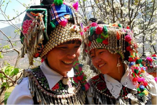 “羅羅潑支”男女服飾的特點:“羅羅潑”男子服飾與“迷撒潑”相差無幾,一般不戴白頭巾。但是婦女的服飾相差卻很大,明顯保留著古樸高雅的南詔遺風(fēng)。頭飾由桂花、包頭、飄帶、大墜子、蜜蜂墜、芝麻鈴組成。桂花墊子在裱布上蒙黑色面料,中間訂有銀飾。包頭以黑色為主,長約2米,后鏈系于包頭,鏈子為銀制。飄帶長約4尺,黑色留花邊,兩頭訂英蘇。包頭還系有大墜子、蜜蜂墜各一對,芝麻鈴20個。領(lǐng)合由裱布黑色面料上訂芝麻玲20個圍在脖子上。圍腰的前胸部,由領(lǐng)口至腹部,左右各垂掛一條綴有串珠、針筒、響篾(口弦)一類飾品和生活用品的銀質(zhì)項鏈。人一走動,全身的小蘇鈴就響,聲音悅耳動聽,形象美觀大方。額頭前還圍有一塊翠綠色的“桂花綁”,綁上釘有銀質(zhì)小泡泡200多顆,羅羅潑支婦女的服飾彰顯華麗之美。