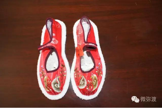 繡花鞋分大口鞋、小口鞋兩種。大口鞋大方素雅,小口鞋古樸艷麗?;佑小胺遐s梅”、“喜鵲登枝”、“獅子滾雪球“、“鳳穿牡丹”和彝族人民結(jié)婚時候,按當?shù)仫L(fēng)俗所需必須穿的“毛邊底”等。這些花樣圖案具有不為時代變幻所動的恒久性質(zhì),蘊藏著濃厚的傳統(tǒng)民俗文化。它給予人們的絕不僅僅是絢麗悅目的美感,還是彝民們征服自然,繁衍生息,爭取愛情和歡樂的記錄。