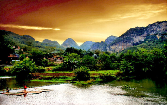 壩美,為壯語(yǔ)譯漢語(yǔ)為:壩—沖口,美—樹(shù) ,因居住的沖口樹(shù)木多而得名。壩美村位于珠江流域西江水系馱娘江上游的阿科河畔。屬喀斯特地貌,區(qū)域內(nèi)山峰奇特,河谷幽美,阡陌縱橫,河流山泉蜿蜒奔流,溶洞層疊散布在山體峰內(nèi),冬無(wú)嚴(yán)寒,夏不酷暑,氣候宜人。因四面環(huán)山,不通公路,進(jìn)出寨子主要靠村前村后兩個(gè)天然的石灰溶巖水洞,村民們要摸著巖壁趟水、撐竹筏、劃獨(dú)木舟、坐小船,經(jīng)過(guò)950米長(zhǎng)的幽暗的“出水洞”和680米長(zhǎng)的“湯拿洞”才能進(jìn)出。由于地處偏僻,交通不便,基本不與外界交往,多年來(lái)壩美村長(zhǎng)時(shí)期與外世隔絕。壩美村水源豐富,氣候溫和,自然生態(tài)環(huán)境未被污染,負(fù)氧離子質(zhì)數(shù)高出城市數(shù)倍,游人在此休憩,心曠神怡,是一個(gè)溫濕潤(rùn),四季宜人的旅游勝地。就生態(tài)環(huán)境和歷史淵源來(lái)說(shuō),《桃花源記》問(wèn)世1500多年,只聞其名,不見(jiàn)其實(shí)。相傳除唐代確認(rèn)湖南省桃源縣的桃源洞為其原型外,目前全國(guó)就有冠名“世外桃源”的地名16個(gè)之多。而今天的壩美,不僅十分相似,而且還神似東晉文學(xué)家陶淵明筆下所描寫(xiě)的“林盡水源,便得一山。山有小口,仿佛若有光;便舍船從口入……土地平曠,屋舍儼然,有良田美池桑竹之屬;阡陌交通,雞犬相聞……”的世外桃源。而且在當(dāng)?shù)卮迕裰杏性S多歷史傳說(shuō):北宋皇祐四年(公元1052年),壯族起義領(lǐng)袖儂智高在邕州(南寧)昆侖關(guān)被狄青打敗后,退入以其繼父儂夏卿為首領(lǐng)的特磨道(廣南)后,至和二年(1055年),宋朝廷又派楊文廣領(lǐng)兵進(jìn)剿,儂智高在突出重圍轉(zhuǎn)至阿科(今廣南縣壩美鎮(zhèn)治所)與宋軍周旋,終因寡不敵眾而離開(kāi)阿科轉(zhuǎn)戰(zhàn)于丘北、開(kāi)遠(yuǎn)、蒙自、元江等地,后到大理不知所終。