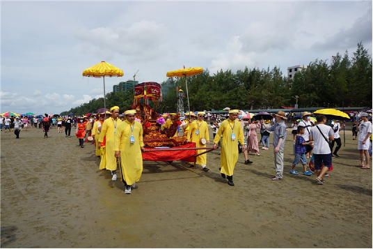 今年適逢中國共產(chǎn)黨成立100周年,活動(dòng)當(dāng)天,氵萬尾村洋溢著濃濃的愛國熱情。活動(dòng)開始,身著京族服飾的當(dāng)?shù)卮迕駠墼谄鞐U前,舉行升國旗奏國歌儀式。隨后迎神隊(duì)伍在鑼鼓和鞭炮聲中到達(dá)海邊,將“海神”迎回哈亭敬奉,祈求人畜興旺,五谷豐登(見圖)。眾多慕名而來的區(qū)內(nèi)外游客集聚哈亭和海邊,與京族同胞一起歡慶這盛大的節(jié)日。