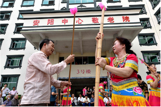 河池文藝志愿者在與老人一起“打扁擔(dān)”。