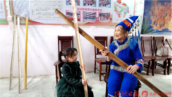 今年已經(jīng)88歲高齡的“壯族打扁擔(dān)”技藝傳承人唐小琴,她從小即耳濡目染,跟村里老人、長者學(xué)習(xí)打扁擔(dān),后因打扁擔(dān)需要指揮,又學(xué)習(xí)皮鼓打法。1961年4月,唐小琴從學(xué)校調(diào)入縣文化館任文化藝術(shù)輔導(dǎo)員,挖掘整理了《壯族打扁擔(dān)》《板凳舞》《斑鳩舞》等一大批傳統(tǒng)舞蹈,并多次在自治區(qū)、河池地區(qū)的比賽、調(diào)演上獲獎。1986年退休后,仍然致力于《壯族打扁擔(dān)》的傳承工作,2004年,組建都安縣老干康樂藝術(shù)團,帶動安陽鎮(zhèn)退休老人學(xué)習(xí)打扁擔(dān)技藝。2009年,她被確認為自治區(qū)非物質(zhì)文物遺產(chǎn)項目“壯族打扁擔(dān)”代表性傳承人。