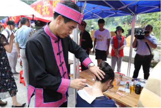 本次活動以2020年“文化和自然遺產(chǎn)日”的“非遺傳承,健康生活”為主題,重點圍繞傳統(tǒng)醫(yī)藥項目保護,普及“非遺”知識和健康生活理念,營造全社會共同參與、關(guān)注和保護傳承優(yōu)秀傳統(tǒng)文化濃厚氛圍而開展。邀請十位瑤醫(yī)藥傳承人帶領(lǐng)40多位瑤醫(yī)弟子各顯神通,在現(xiàn)場開展非遺項目義診活動,為游客免費問疹,展示泡藥療法、針灸療法、燈草療法、坐浴療法、拉伽通灸療法等10種技法?,幷锩恳粦羧思夷贸瞿檬纸^活在自家進行現(xiàn)場展示,黃泥鼓制作、樹葉豆腐制作、瑤族織繡技藝、釀酒技藝、舂糍粑、原創(chuàng)歌曲展示等,豐富多彩的各種技藝,讓游客流連忘返。