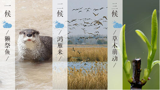 我國古代將雨水分為三候:“一候獺祭魚,二候鴻雁來,三候草木萌動?!?此節(jié)氣,水獺開始捕魚了,人們將魚擺在岸邊先祭祀后食用;五天過后,大雁開始從南方飛回北方;再過五天,在“潤物細無聲”的春雨中,草木因地中陽氣的上騰而開始抽出嫩芽。從此,大地漸漸開始呈現出一派欣欣向榮的景象。