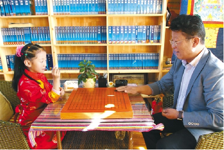 西藏自治區(qū)藏棋協會秘書長阿旺邊巴正在與孩子下棋。