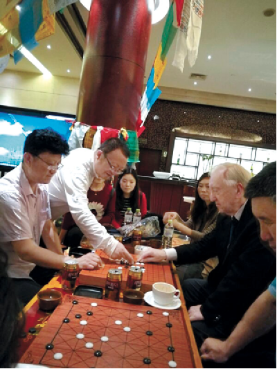 阿旺邊巴(左一)與外國藏棋研究學者交流藏棋文化。