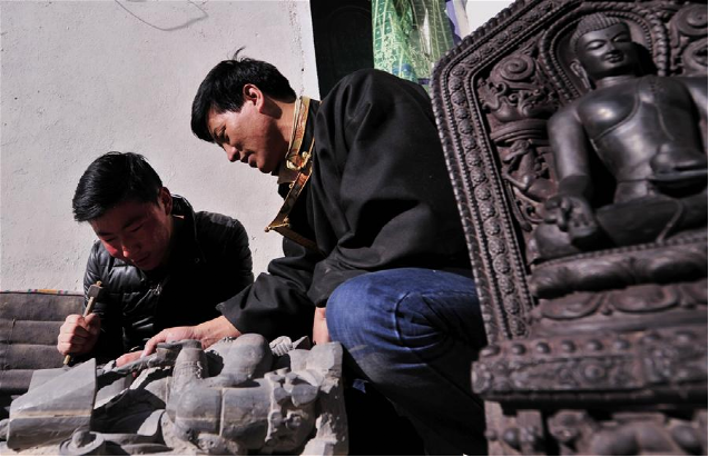 伴隨著收音機傳出的旋律,西藏自治區(qū)級黑玉石雕刻技藝非物質文化遺產(chǎn)傳承人土登加措和他的徒弟們開始了又一天的黑玉石佛像雕刻工作。黑玉石產(chǎn)生于海拔4500米以上的石山上,是高原特有的一種石材。據(jù)古書記載,西藏第一代藏王聶赤贊普曾將天降的經(jīng)書、塔模等佛教圣物封存于洞中,并以黑玉石雕刻佛塔做蓋,于是便有了西藏歷史上有記載的第一件黑玉石雕刻作品。作為這門技藝的第五代傳人,土登加措延續(xù)著家族的技藝,一直傳承著這門古老的技藝。西藏黑玉石雕刻技藝在2012年入選第四批西藏自治區(qū)級非物質文化遺產(chǎn)名錄,土登加措如今已有近30名弟子,古老的黑玉石雕刻技藝正在慢慢走向世界。新華社記者 晉美多吉 攝
