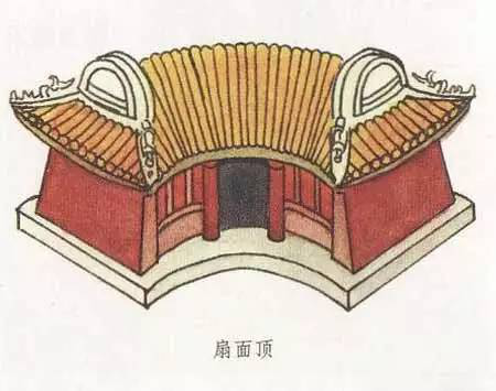 扇面頂和萬字頂一樣,是一種非常別致的屋頂形式,扇面頂顧名思義,就是扇面形狀的屋頂形式,其最大特點(diǎn)就是前后檐線呈弧形,弧線一般是前短后長(zhǎng),即建筑的后檐大于前檐。建筑的西山墻的墻線若向內(nèi)延伸,可以交于一點(diǎn),而這一點(diǎn)就是扇形的扇子柄端。扇面頂?shù)膬啥丝梢宰龀尚?、懸山,也可做成卷棚形式。扇面頂一般都用在形體較小的建筑中,會(huì)讓建筑看起來更為小巧可愛。