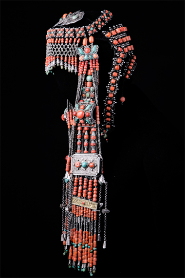 髻側(cè)流蘇飾:系于鬢角兩側(cè),其上部銀飾造型從整體上看似飛翔狀蝴蝶,鑲嵌精美紅珊瑚珠、綠松石,造型熱情似火。蝴蝶銀飾之下垂系五條流蘇, 由紅珊瑚珠、綠松石珠及銀珠串間隔穿成五段,下墜蝴蝶型銀飾帽, 內(nèi)銜桃形瑪瑙墜,流蘇在鬢角兩側(cè)隨頭的轉(zhuǎn)動(dòng)而飄擺, 響聲清脆。