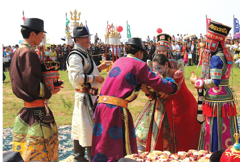 在蒙古民族人生禮儀中,其婚禮儀式最為隆重、熱烈,充滿草原文化綜合特征。蒙古人婚禮習俗經歷了從最早的原始群婚、偶婚到后來一夫一妻婚姻制度的發(fā)展過程。至13世紀,蒙古人的婚禮習俗已趨完整?!睹晒琶厥贰份d,鐵木真九歲時,其父耶速格巴圖爾(漢書譯作“也速該把禿兒”)帶他與翁吉刺惕的德·薛禪之女勃兒帖定親時就有許多規(guī)矩。
