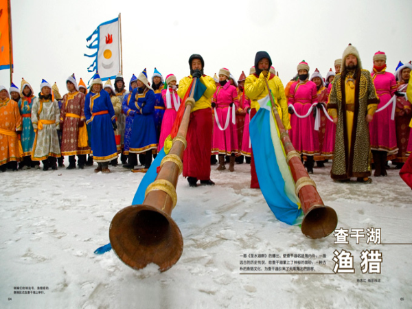 據(jù)記載,一千年前的遼金時(shí)期,這里就是天然的漁獵之地。傳說(shuō)遼帝圣宗喜吃“冰魚”,每年臘月,便率領(lǐng)家眷浩浩蕩蕩來(lái)到冰凍的查干湖上扎營(yíng)。遼帝在行宮中接見大宋使臣,商談國(guó)家大事,會(huì)見部落首領(lǐng),命令仆人將帳篷里的冰層刮薄,直至薄如紙片,冰下游動(dòng)的魚清晰可見。吃飯時(shí),便將薄冰輕輕擊破,水中鮮活的魚兒會(huì)急不可待地跳出冰面,歷史上 把這種捕魚方式叫“春捺缽”。