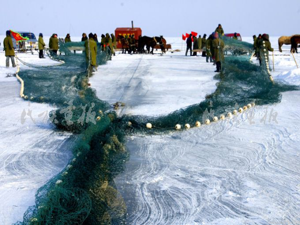 一切就緒,馬匹牽引著馬輪子絞動(dòng)大繩開始收網(wǎng),后面“跟網(wǎng)”的用大鉤將漁網(wǎng)一點(diǎn) 點(diǎn)放入冰下。大約過(guò)去五六個(gè)小時(shí),整張魚網(wǎng)被全部放入水中,緊緊地包圍了冰層下面的 水域。