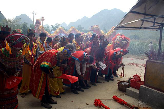 壯族霜降節(jié)頭降的早晨,先要在戲臺(tái)舉行隆重的酬謝活動(dòng)。人們進(jìn)行祭拜,從請(qǐng)神、求神到送神,將壯族美好和諧的祈愿寄托在美好的自然事物身上,以表達(dá)對(duì)自然之神的崇敬之情,表達(dá)祈盼五谷豐登的良好愿望。近年還增加了祈福長(zhǎng)壽的內(nèi)容。